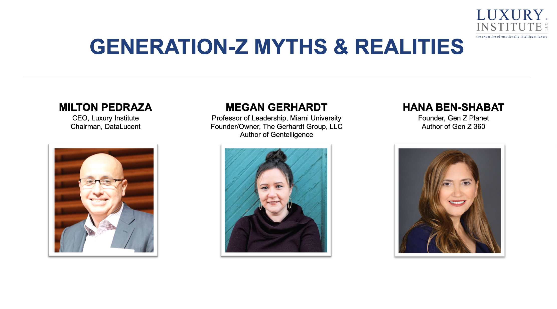 On September 30, 2021, Milton Pedraza, Luxury Institute CEO and DataLucent Chairman, interviewed Megan Gerhardt and Hana Ben-Shabat to discuss the myths and realities of Generation-Z and understand this generation as consumers as well as their expectations in the workplace.