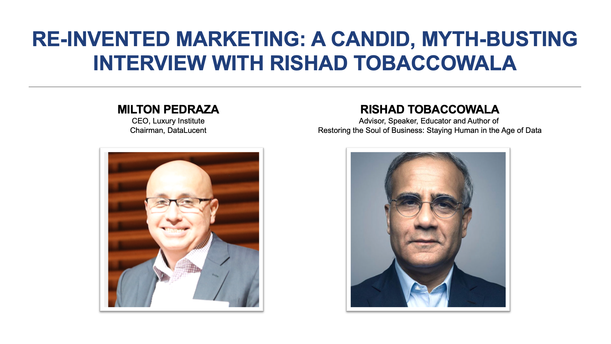 On October 6, 2021, Milton Milton Pedraza, Luxury Institute CEO and DataLucent Chairman, hosted a candid, myth-busting conversation about the ABCDEs of Reinvented Marketing with advisor, speaker, educator, and author of Restoring the Soul of Business: Staying Human in the Age of Data, Rishad Tobaccowala.