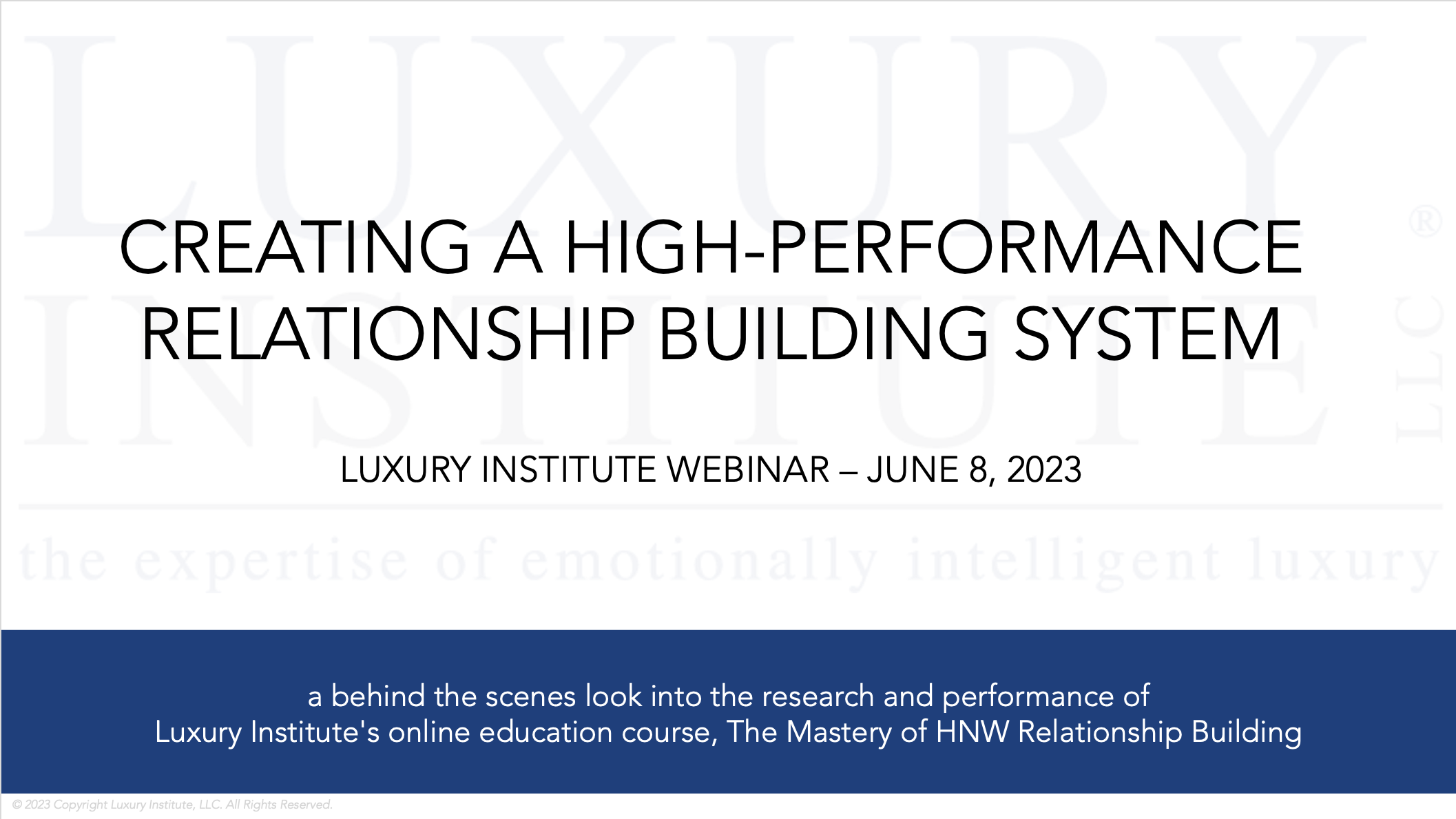 Luxury Institute recently launched its online education course, The Mastery of HNW Relationship Building, which is built on the fundamentals of its proprietary Luxcelerate High-Performance System.